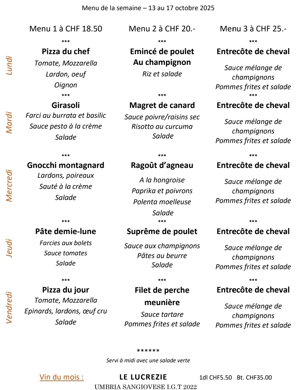 Alain Lamonato2024-03-10Trustindex vérifie que la source originale de l'avis est Google. Restaurant facilement accessible en voiture et qui propose de délicieuses pizza au feu de bois. Le personnel est aimable et serviable. Diga 732024-02-29Trustindex vérifie que la source originale de l'avis est Google. Belle découverte! Vaste restaurant joliment aménagé avec une terrasse. Carte variée pour une bonne nourriture et un bon service. Vivement recommandé Jesse Handschin2024-02-14Trustindex vérifie que la source originale de l'avis est Google. This Restaurant happens to be near my house, so its our « go to » family restaurant. We usually go for Pizza (that are amazing) but recently I have been trying their Meat-dishes and boy was I in for a treat! Really delicious and perfectly cooked steaks with very high quality meat! I highly recommend this Restaurant!Évaluation Google : 4.2 sur 5, Basée sur 339 avis